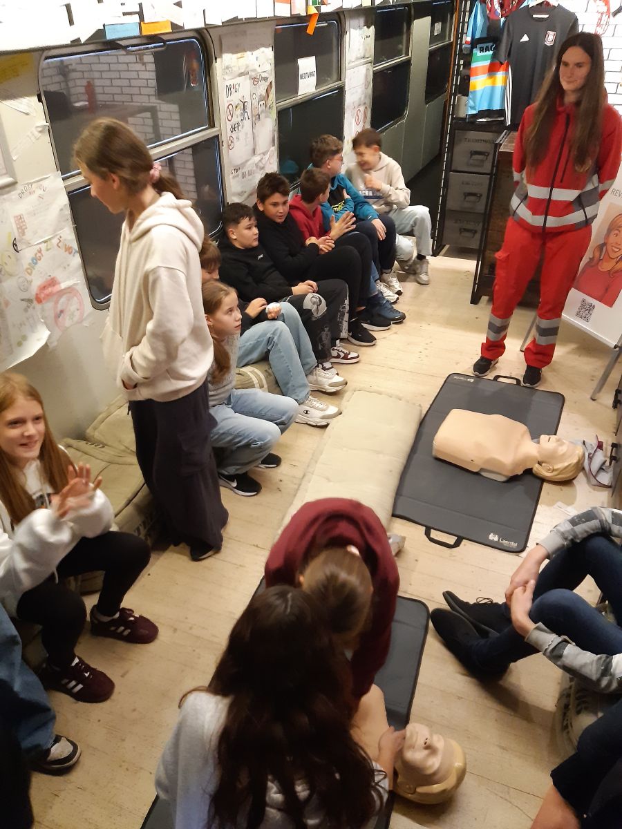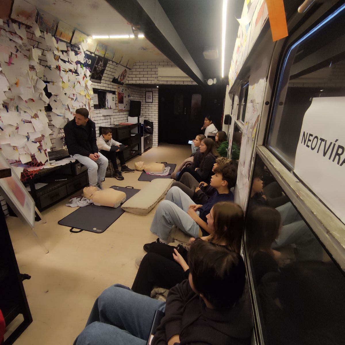 Žáci VII. A a VII. B se ve čtvrtek zúčastnili vzdělávacího programu Revolution Train, který představuje interaktivní pojetí protidrogové prevence. Projekt žákům poutavou formou přiblížil rizika spojená s užíváním návykových látek a pomohl jim lépe porozumět důsledkům závislosti. Každý z vagónů představoval jedno z prostředí, které děti viděly v příběhu. Ocitly se tak například ve squatu či v baru. Na závěr si mohly prakticky vyzkoušet techniku poskytování první pomoci.
