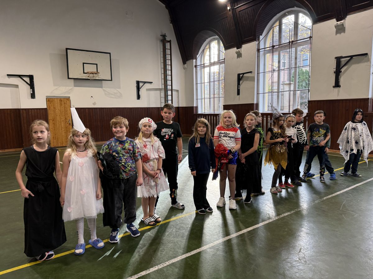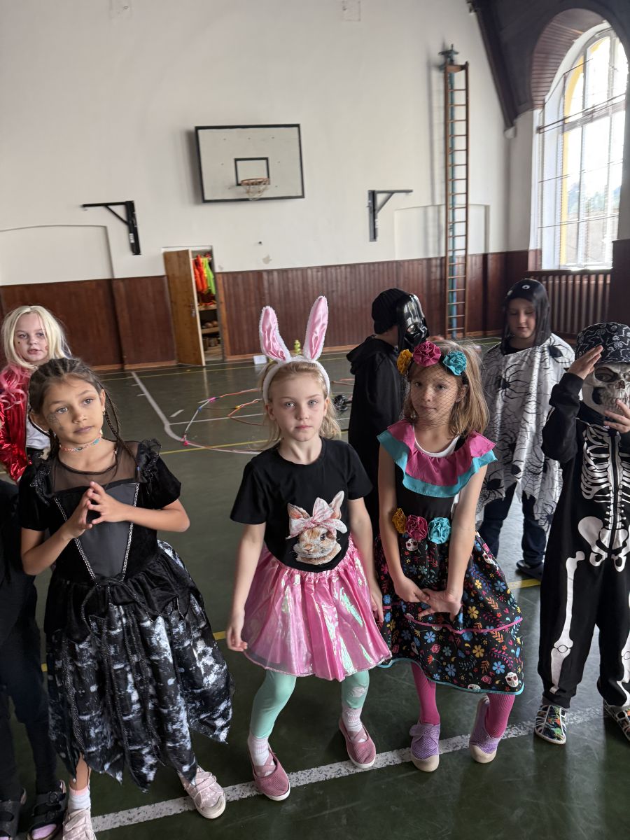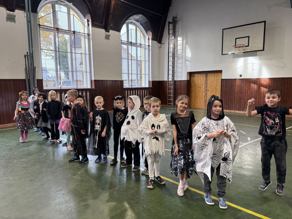 V pátek odpoledne se naše školní družina proměnila v opravdové strašidelné království. Akce se zúčastnily žáci I. B. Tělocvična se hemžila malými čaroději, duchy, netopýry i kostlivci. Děti si mohly vyzkoušet za hudebního doprovodu různé soutěžní disciplíny, jako třeba skákání v pytli mezi slalomem z dýní, hod na dýně, lovení pavouků, strašidelná krabice, foukání duchů a spousta jiných.