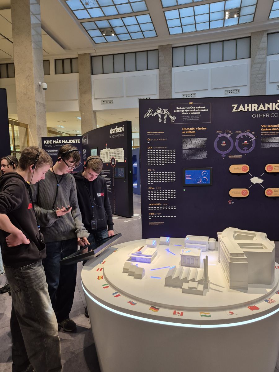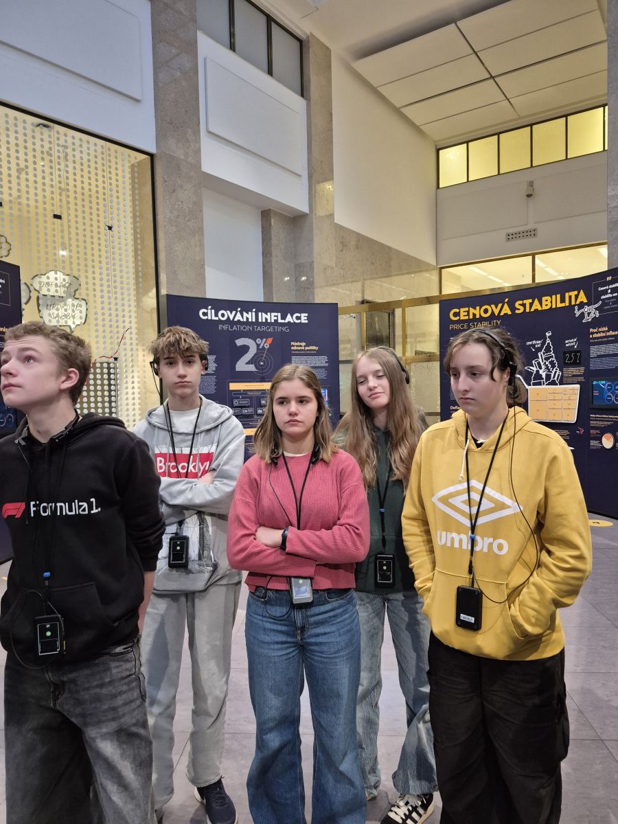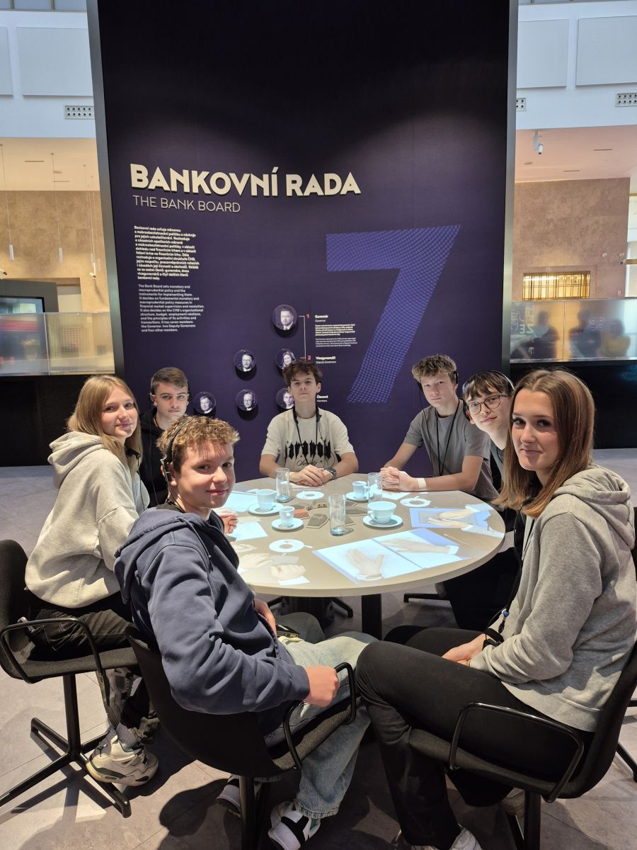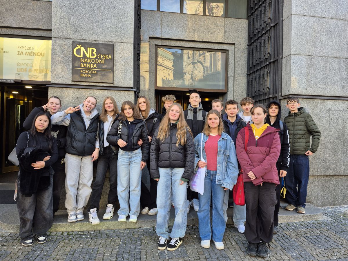 V pátek se IX. B vydala poznat vše, co se skrývá za naší měnou. Dozvěděli jsme se, co všechno ČNB dělá, aby dosáhla v naší zemi cenové a finanční stability. Poznali jsme, kdo a jak rozhoduje o nástrojích měnové politiky, kolik členů má bankovní rada, jaké ochranné prvky najdeme na bankovkách, o funkcích peněz, o možnostech platby, o vzniku bankovek. Někteří se zvážili v tisícikorunách, někdo si zajezdil na kole a soutěžil s inflací. Informací bylo hodně, workshopy zajímavé, průvodce skvělý a prostředí ČNB honosné.