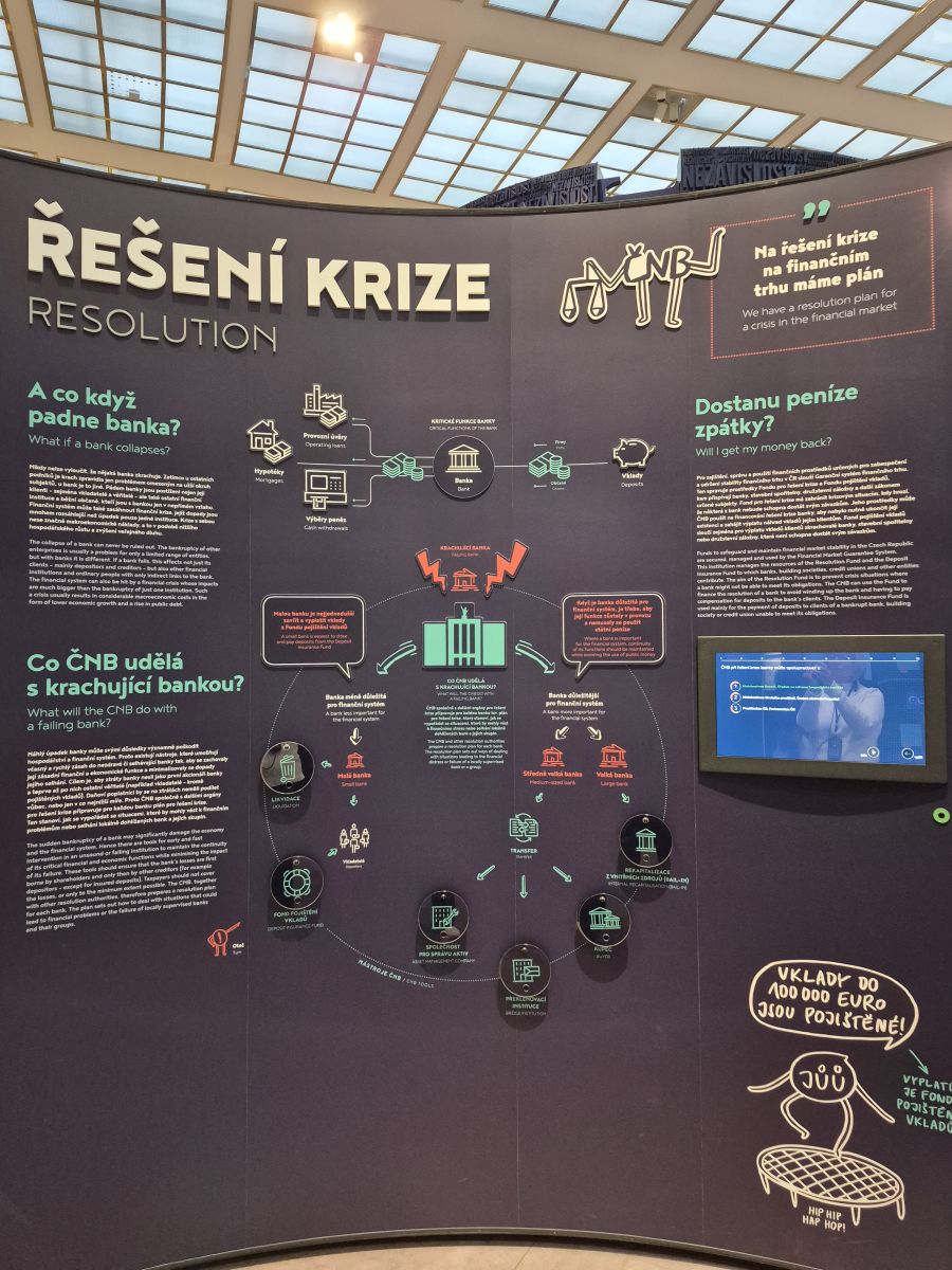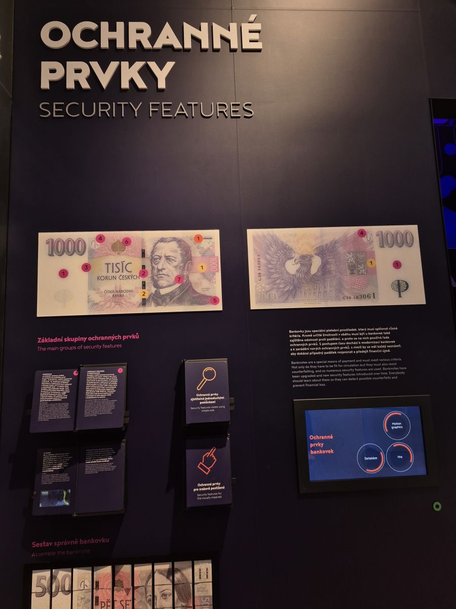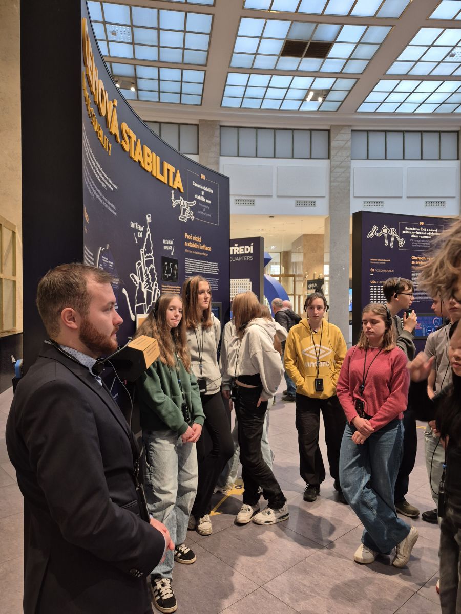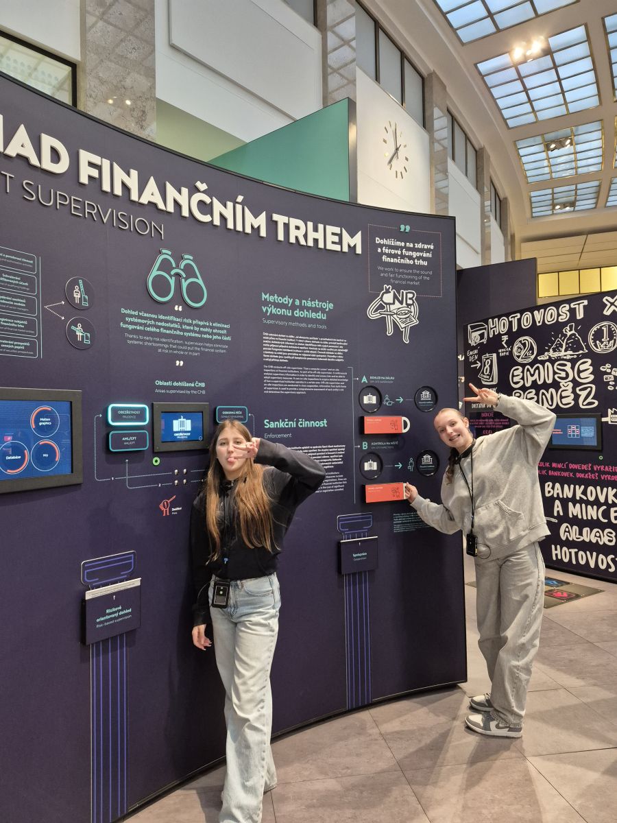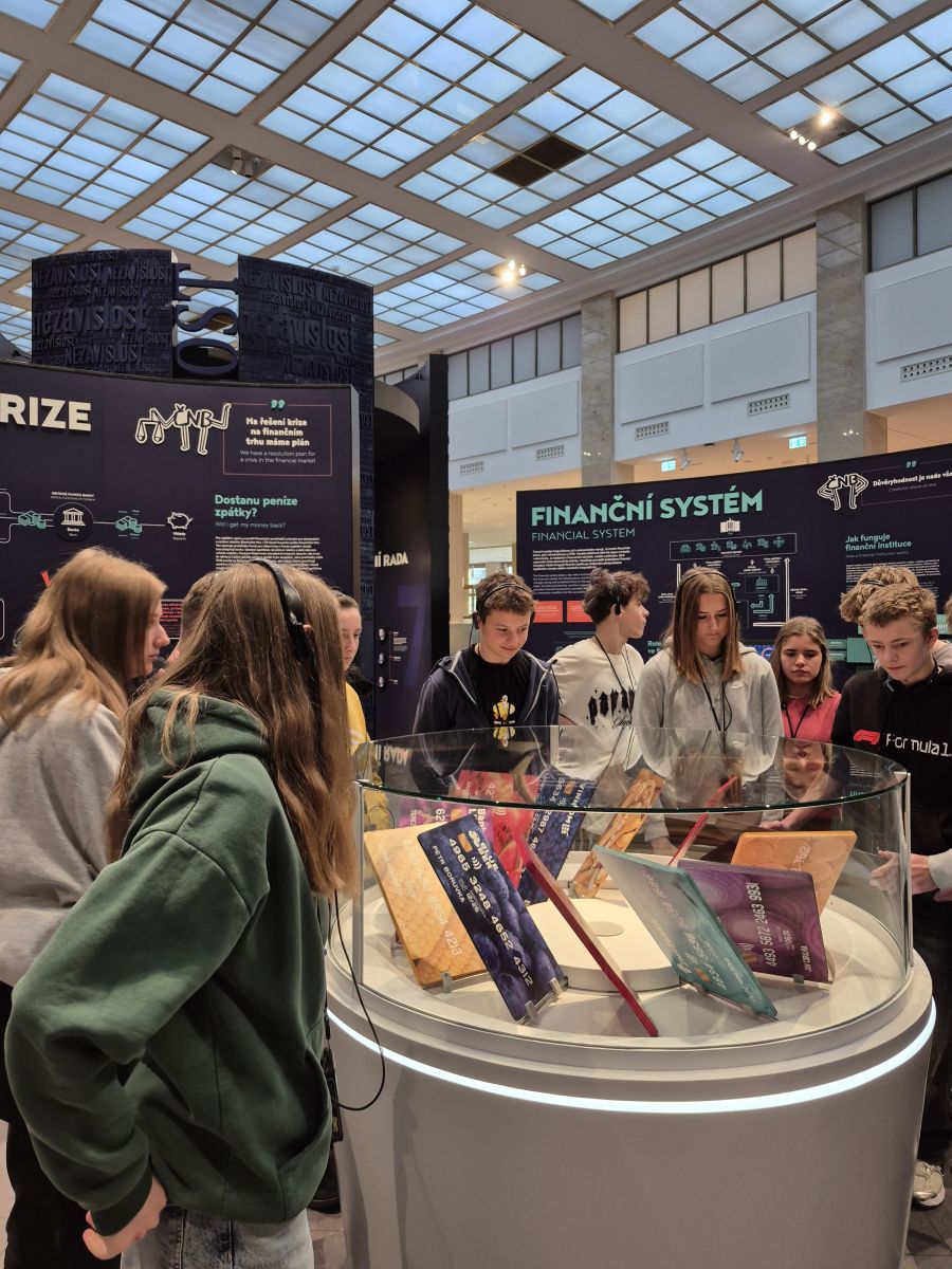 V pátek se IX. B vydala poznat vše, co se skrývá za naší měnou. Dozvěděli jsme se, co všechno ČNB dělá, aby dosáhla v naší zemi cenové a finanční stability. Poznali jsme, kdo a jak rozhoduje o nástrojích měnové politiky, kolik členů má bankovní rada, jaké ochranné prvky najdeme na bankovkách, o funkcích peněz, o možnostech platby, o vzniku bankovek. Někteří se zvážili v tisícikorunách, někdo si zajezdil na kole a soutěžil s inflací. Informací bylo hodně, workshopy zajímavé, průvodce skvělý a prostředí ČNB honosné.