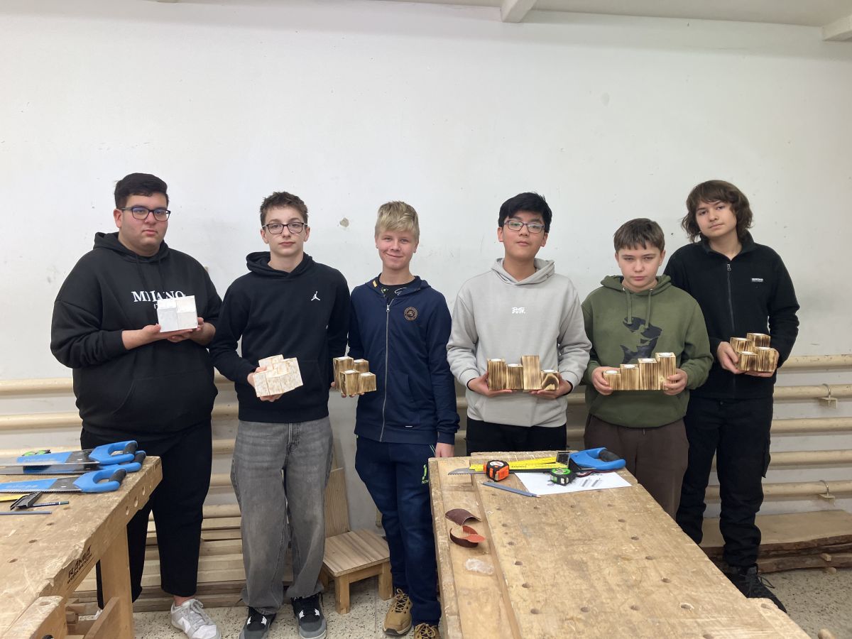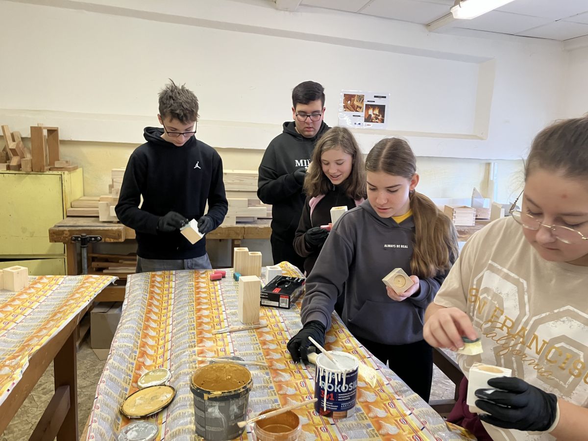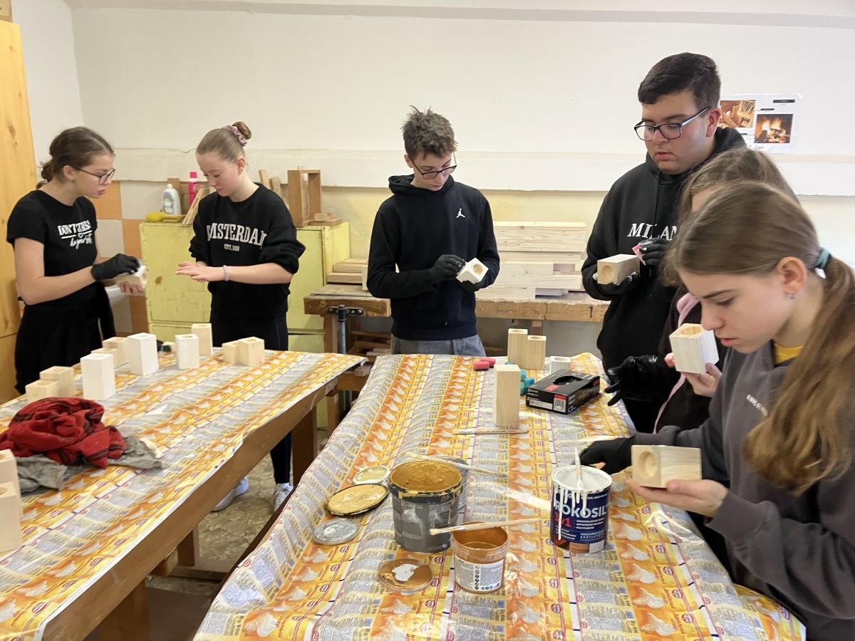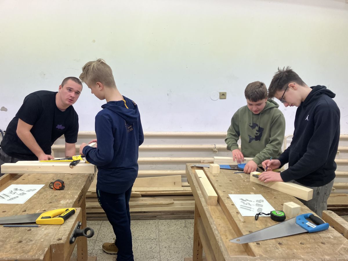 Na programu pro nás bylo vyrábění svícnů na Vánoce. Dostali jsme dřevo, které jsme si naměřili, a podle potřeby uřízli. Uříznutý kousek jsme si obrousili, namalovali nebo opálili a vzniklé hranolky jsme si slepili k sobě. Každý si domů odnesl svůj výrobek. Pan mistr truhlářů nás mile překvapil malou svačinkou.
