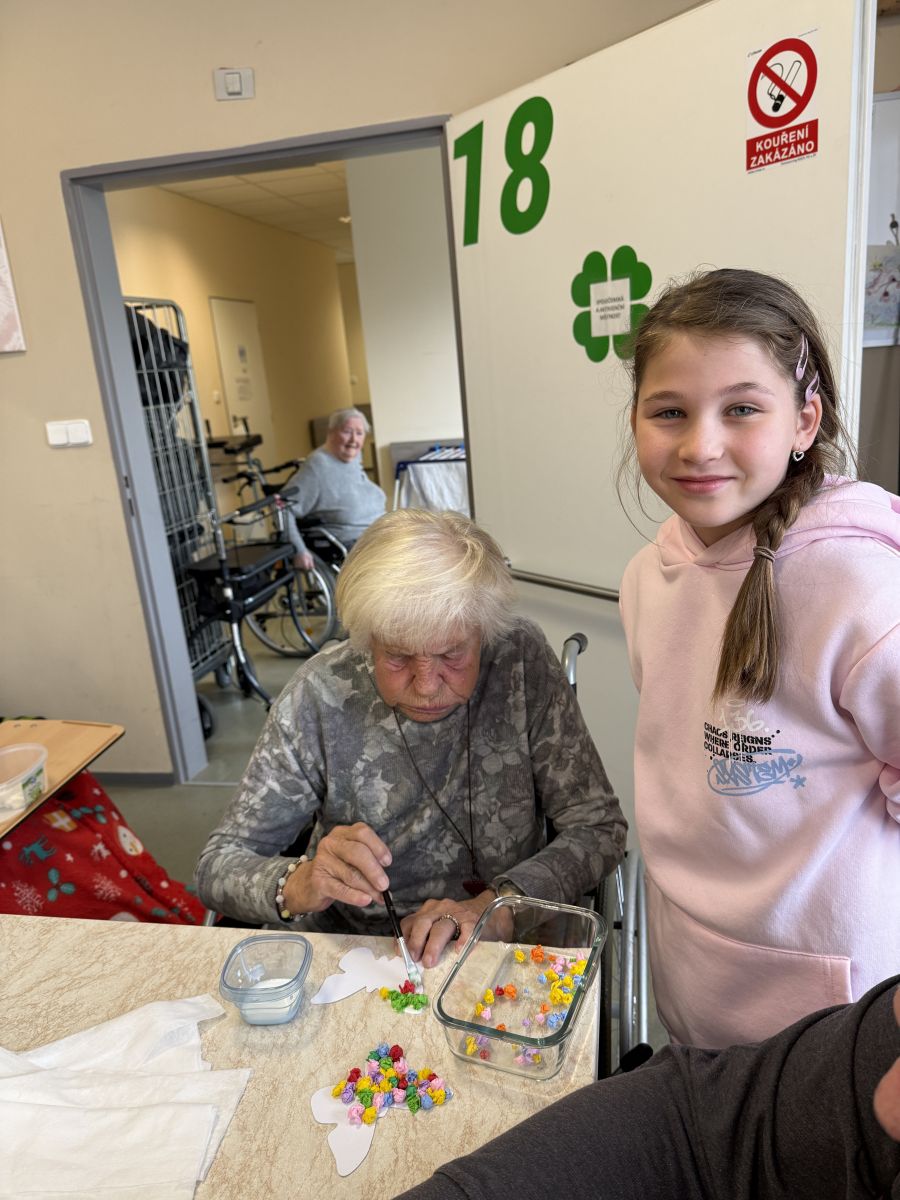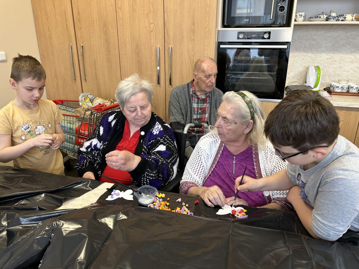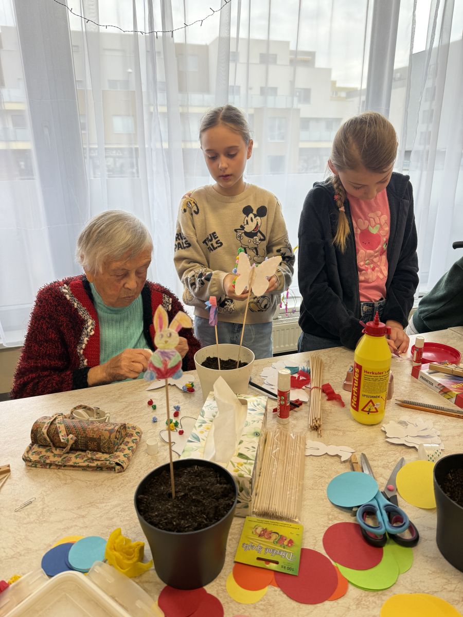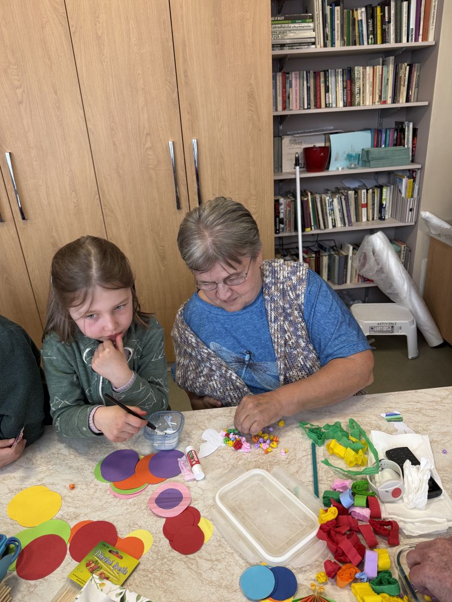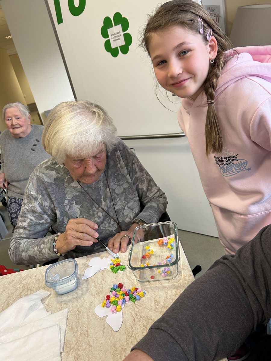 Pokračujeme v mezigeneračním přátelství. Tentokrát jsme se seniory vytvářeli velikonoční osení, barevné zápichy a někteří i vyšlehali babičky pomlázkou. Těšíme se zase na příští akci!