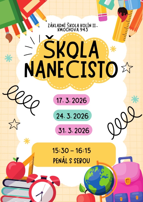 Děti, které půjdou příští školní rok do první třídy, si mohou vyzkoušet vyučování v opravdové škole. Škola nanečisto probíhá v daných termínech od 15:30 do 16:15 v prostorách naší školy.